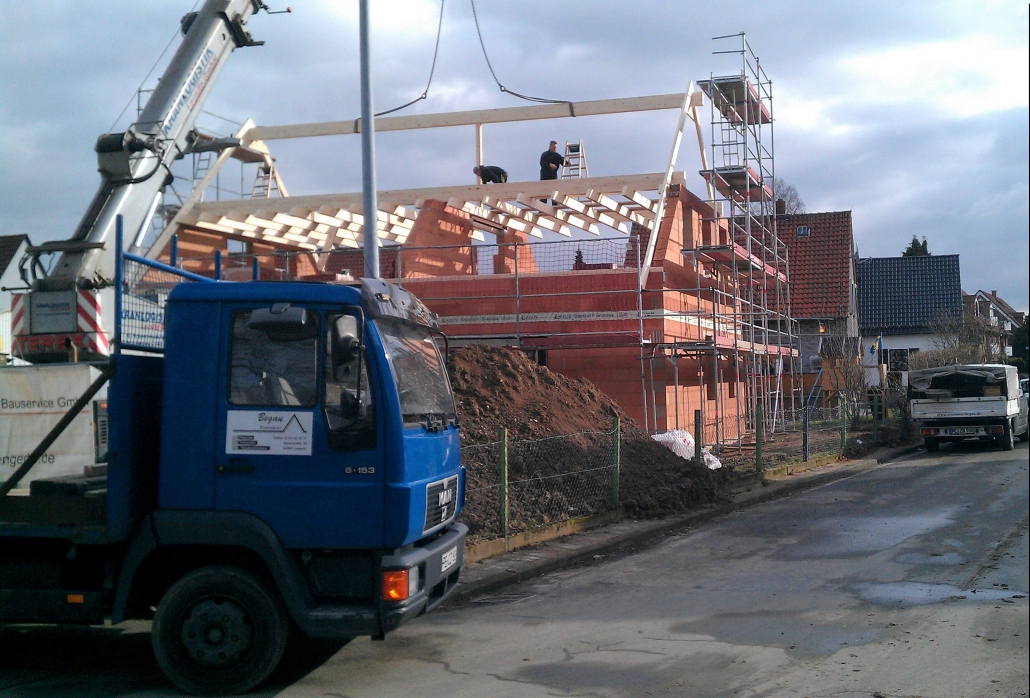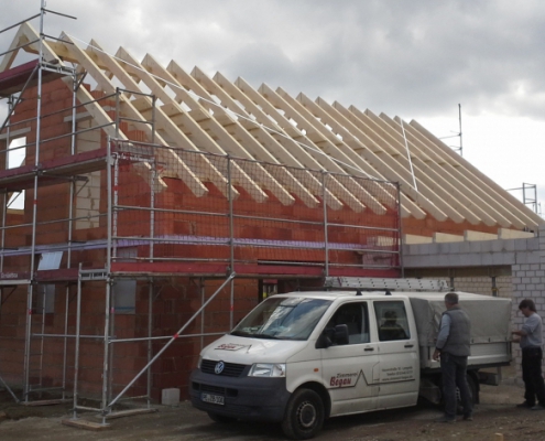 Der Zuschnitt des Holzes für Ihr Holzdach erfolgt in unserer Zimmerei noch per Hand So sind wir flexibel genug, um auf eventuelle Änderungswünsche eingehen zu können. Nach dem Richten Ihres Dachstuhls durch unser erfahrenes Team, schmückt dann der Richtkranz die „Krone Ihres Daches“.